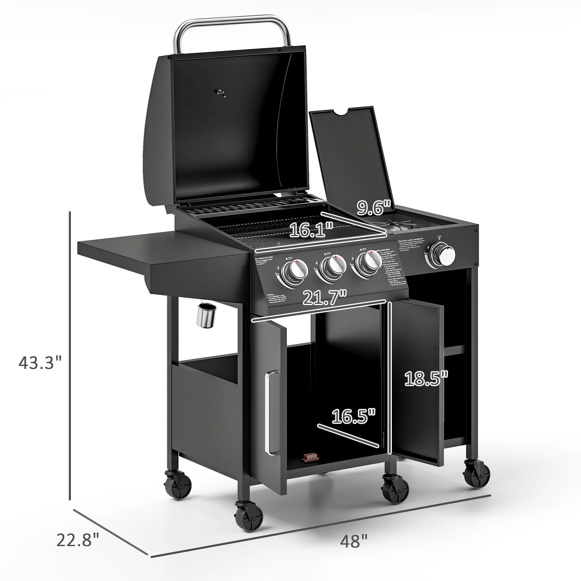 • - Cabinet Inner: 21.7" W x 16.5" D x 18.5" H, for 20 lbs. cylinder