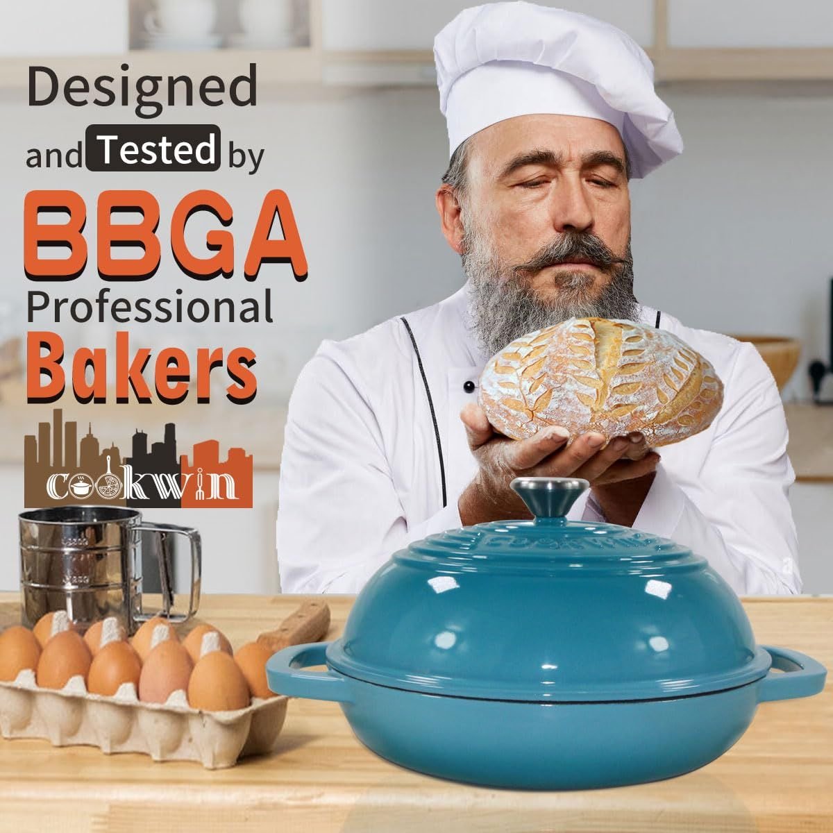 1.ULTIMATE BREAD OVEN:COOKWIN enameled cast iron Dutch oven is your ticket to bread-baking success! Measuring 14" in diameter with handles, 11" without handles,6.6" high with the knob,weighing 13.2 lbs,6 quart.Our bread oven includes a Non-Stick&Easy Clean,Reusable Silicone Baking Liner,sized 21" x 8.7",a Heat-resistant cap and 2 piece silicone handles-Designed for use when handling the pot's handle and lid,ensuring a comfortable grip and preventing burns.